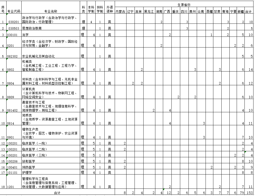 按教育部要求,我校2020年少数民族预科班共计划招生153人,其中内蒙古8人、辽宁2人、黑龙江2人、吉林4人、湖南4人、广西12人、重庆2人、四川6人、贵州5人、云南6人、西藏3人、甘肃7人、青海7人、宁夏6人、新疆79人。 2020年招收的少数民族预科班学生通过一年预科学习后,转入本科专业学习。 具体招生计划如下: