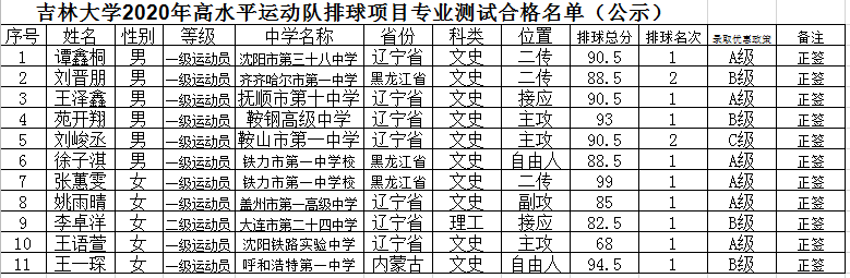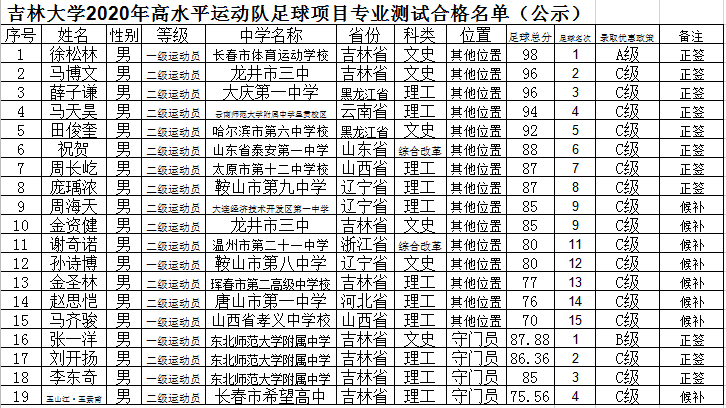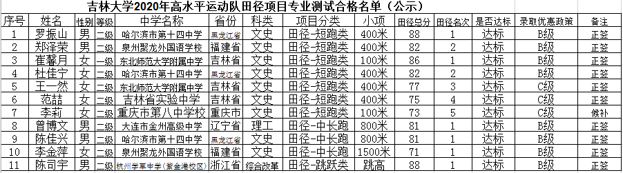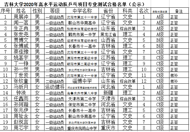 按照教育部《关于做好2020年普通高校特殊类型招生工作的通知》(教学司﹝2019﹞10号)文件要求,根据招生简章、测试成绩及我校高水平运动队的建设需要,我校确定了高水平运动队专业测试合格名单共计61人,其中:含A级资格考生13人、B级资格考生15人、C级资格正签考生22人、C级资格候补考生11人,现予以公示。公示期:7月17日至7月26日,如有异议请向我校招生办公室或监察处反映。如发现学生有弄虚作假、舞弊等行为,经核实无误后即取消其资格。所产生的空缺名额不再递补。