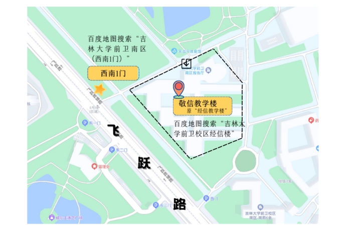校外考生请持身份证和准考证于4月22日早6:00后,从吉林大学前卫南区西南1门校门进入校园(仅限行人通行)。