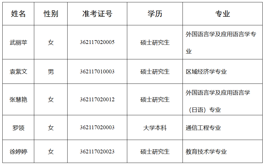 经江西省2021年选调生招录工作有关程序,确定武丽苹等5名同志为江西省2021年选调生拟录用人员(名单附后),现按规定进行公示,公示时间为2021年5月19日至25日。公示期间,如对拟录用人员有异议,请向中共江西省委组织部干部队伍建设规划办公室反映。